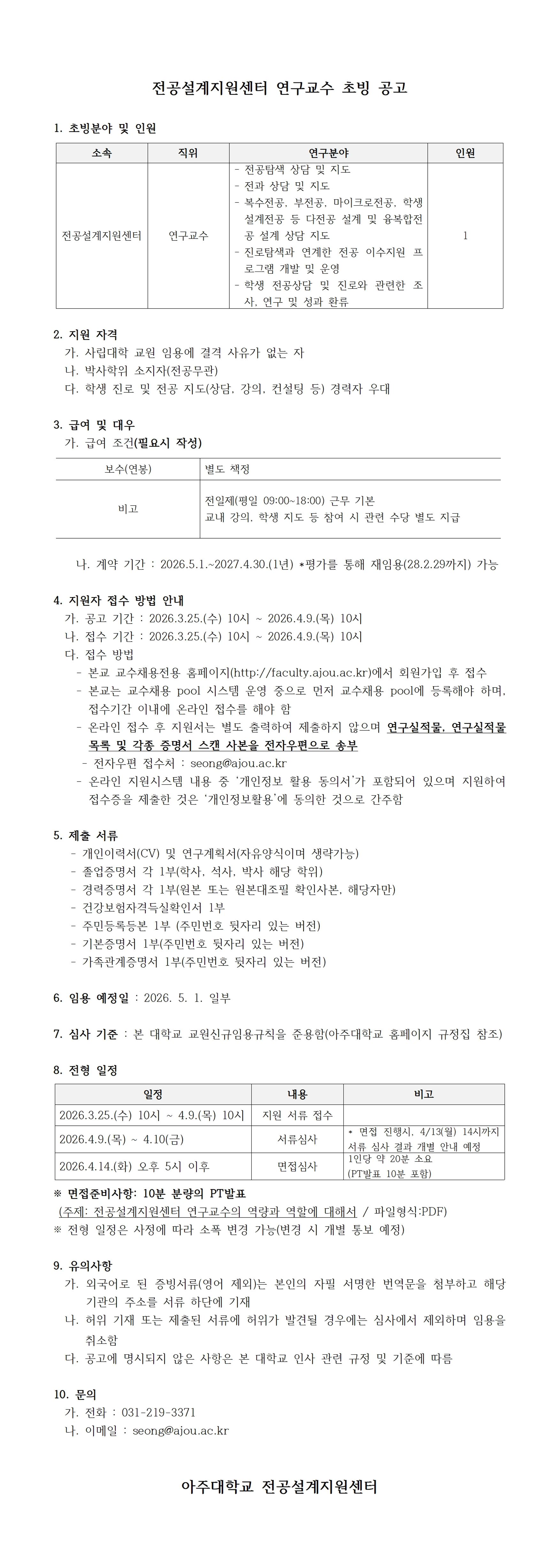 [공지] 2026학년도 1학기 아주대학교 전공설계지원센터 연구교수 초빙 공고 (2026.05.01일자)