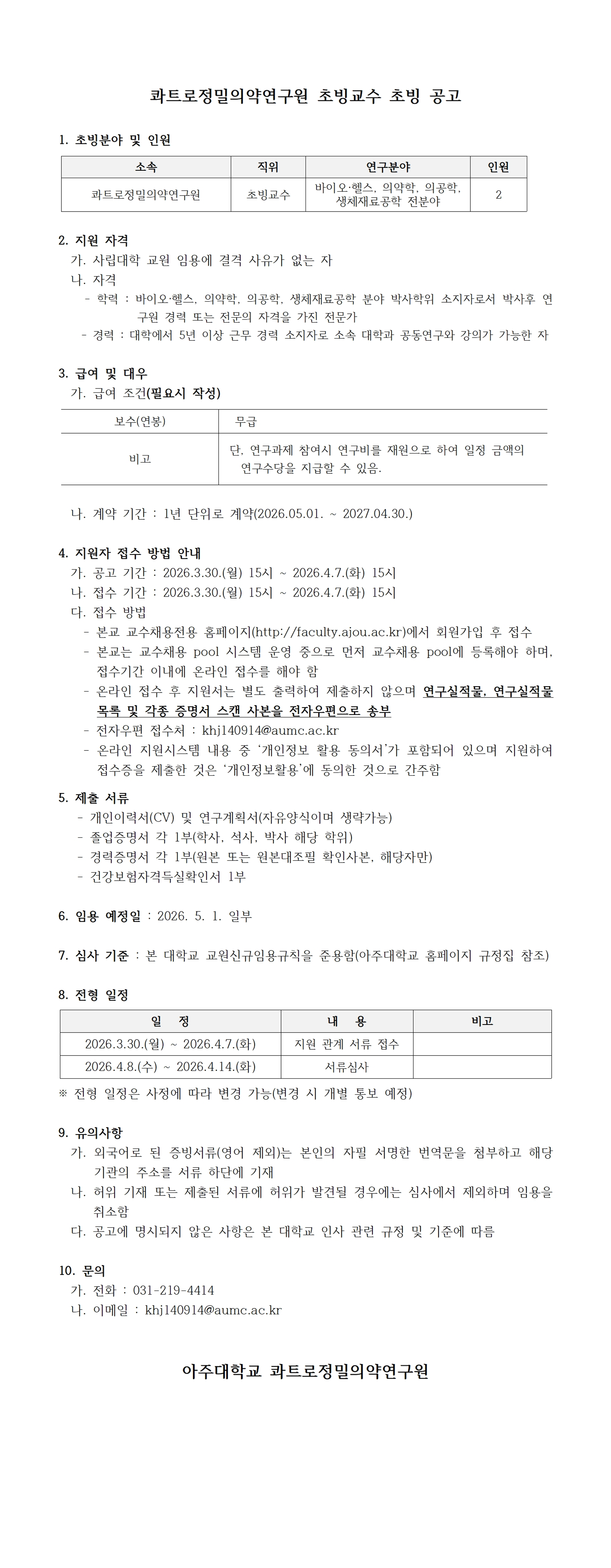 [공지] 2026학년도 1학기 아주대학교 콰트로정밀의약연구원 초빙교수 초빙 공고 (2026.05.01일자)