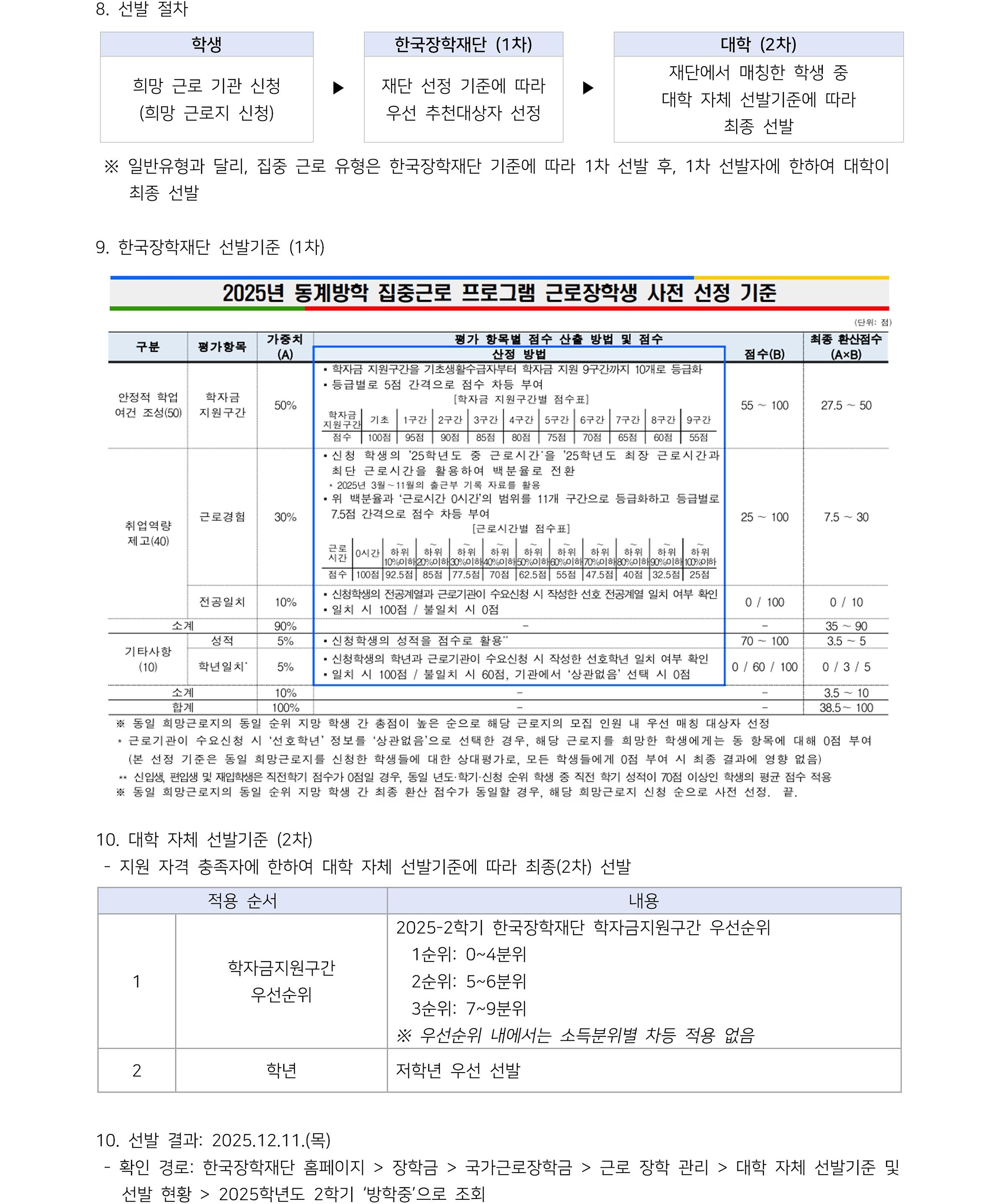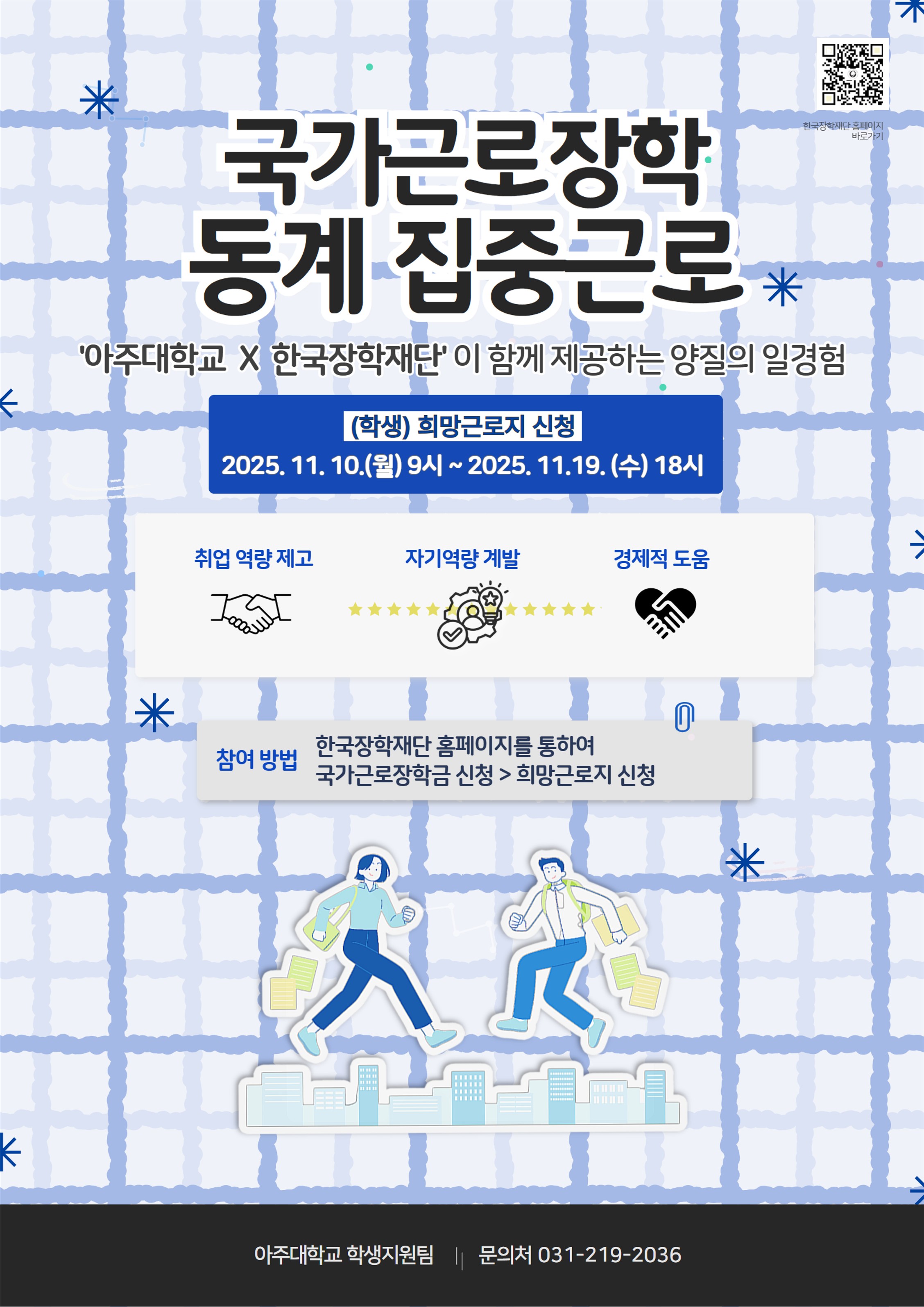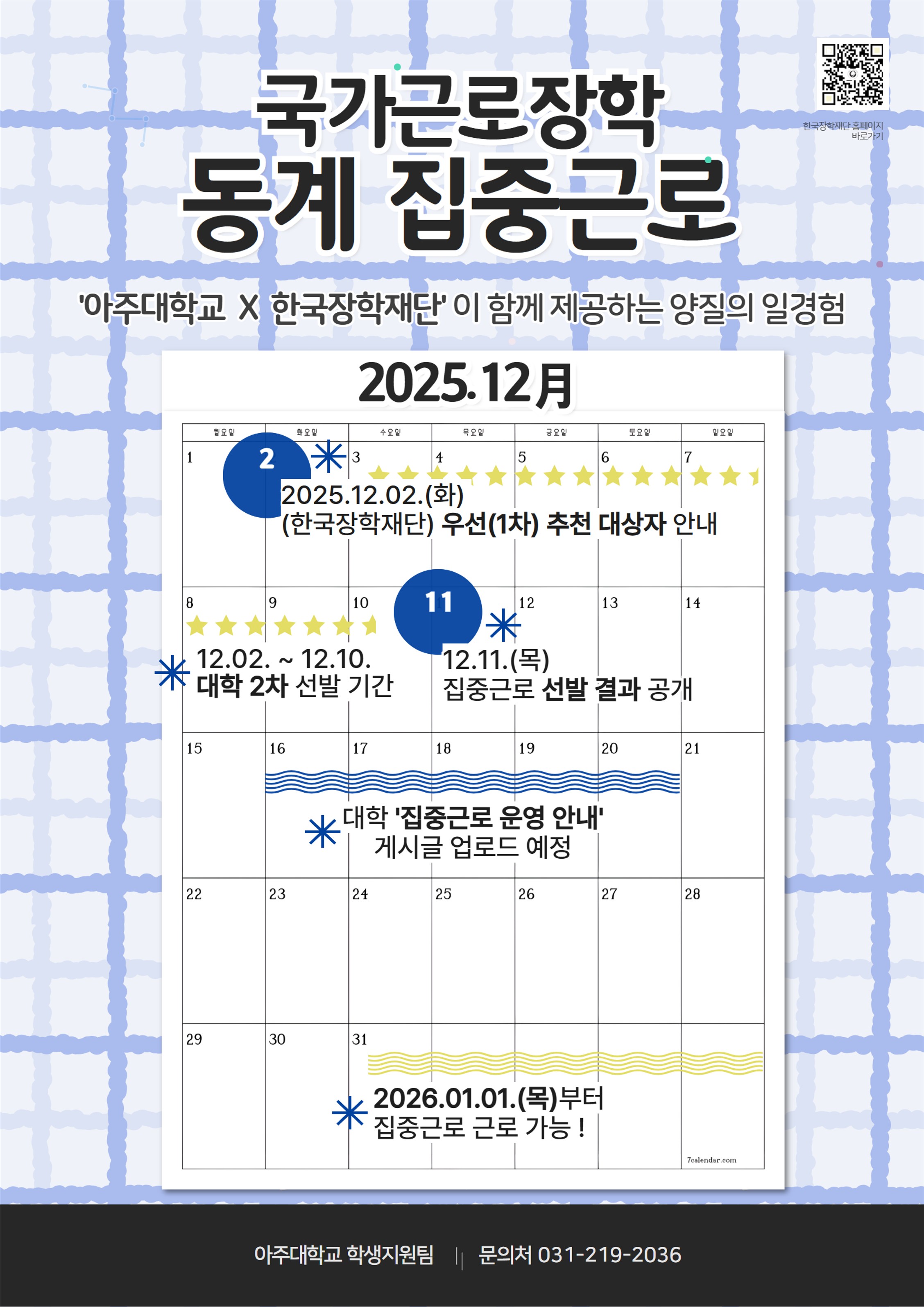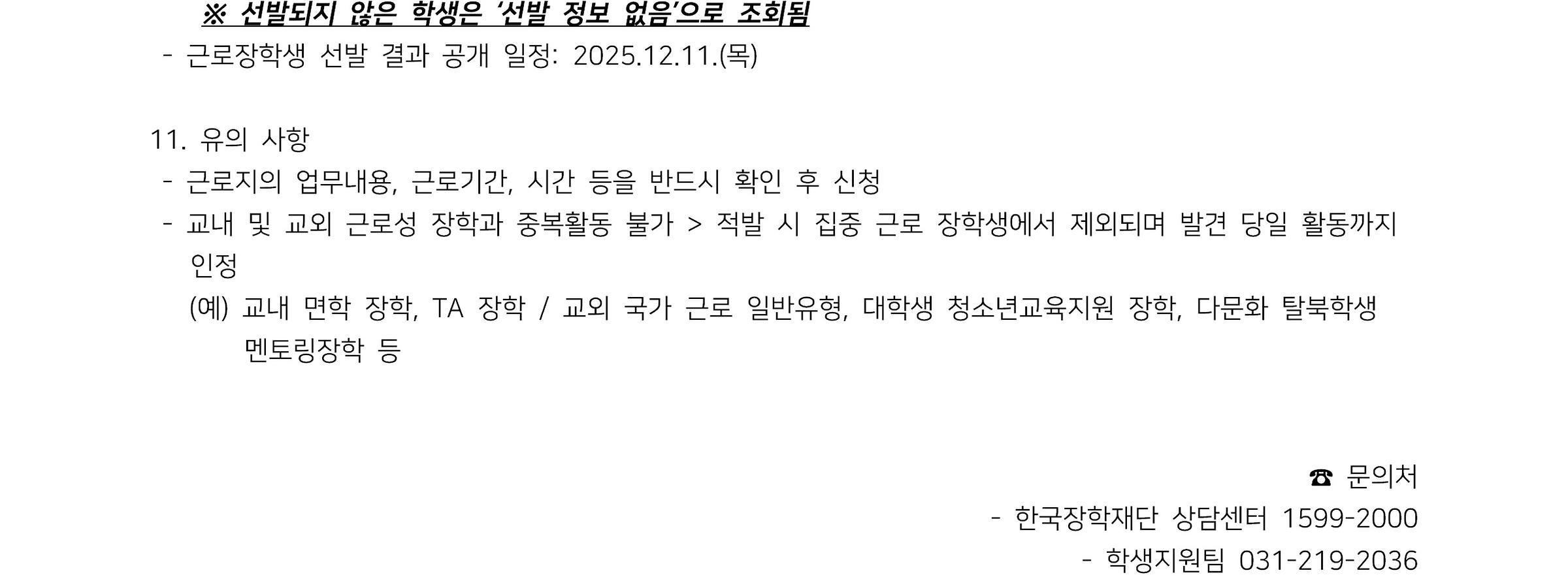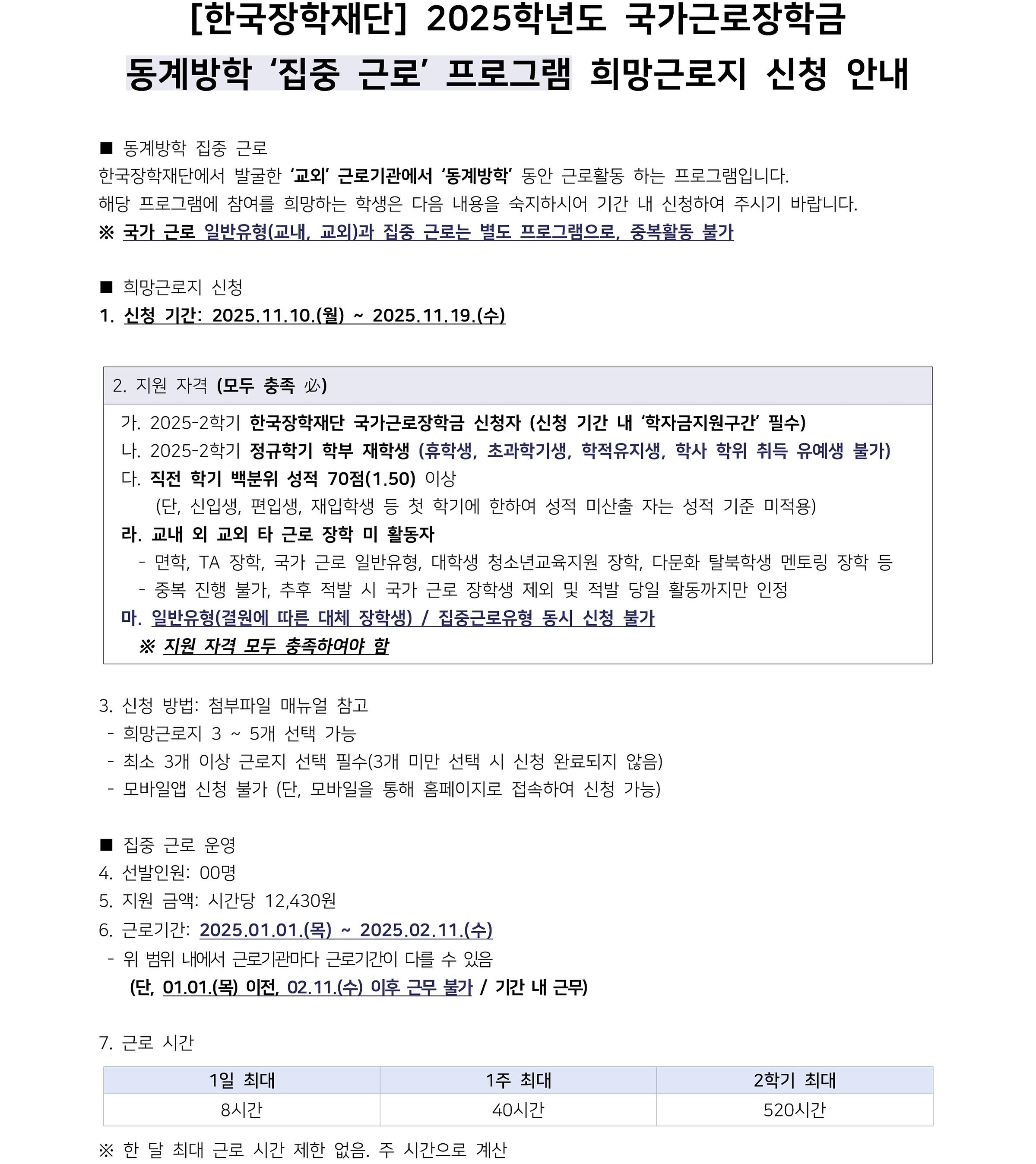 ※ 국가근로장학 동계 집중근로 희망근로지 신청은 2025.11.10.(월)부터 한국장학재단 홈페이지에서 신청 가능합니다.