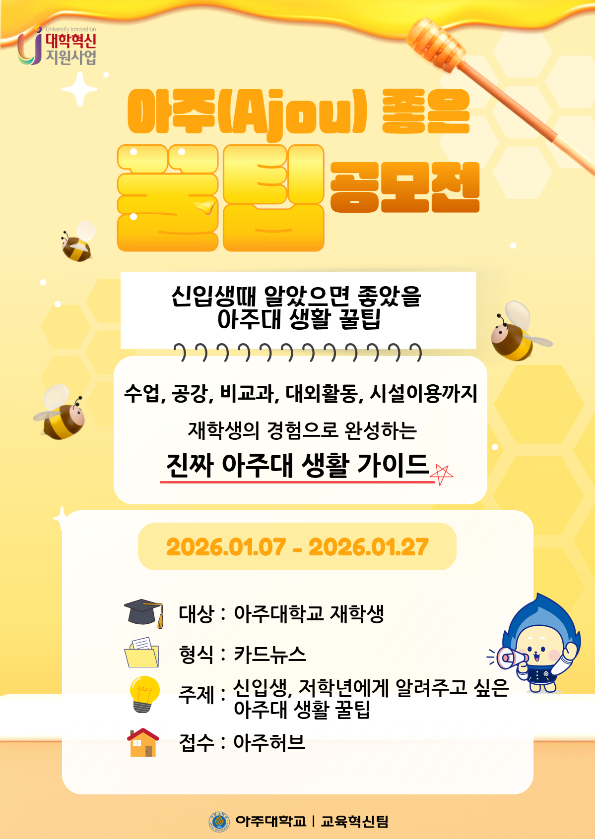 3. ๊ณต๋ชจ์ฃผ์ œ : ์‹ ์ž…์ƒ์—๊ฒŒ ์†Œ๊ฐœํ•ด์ฃผ๊ณ  ์‹ถ์€ ์•„์ฃผ๋Œ€ํ•™๊ต ์ƒํ™œ ๊ฟ€ํŒ