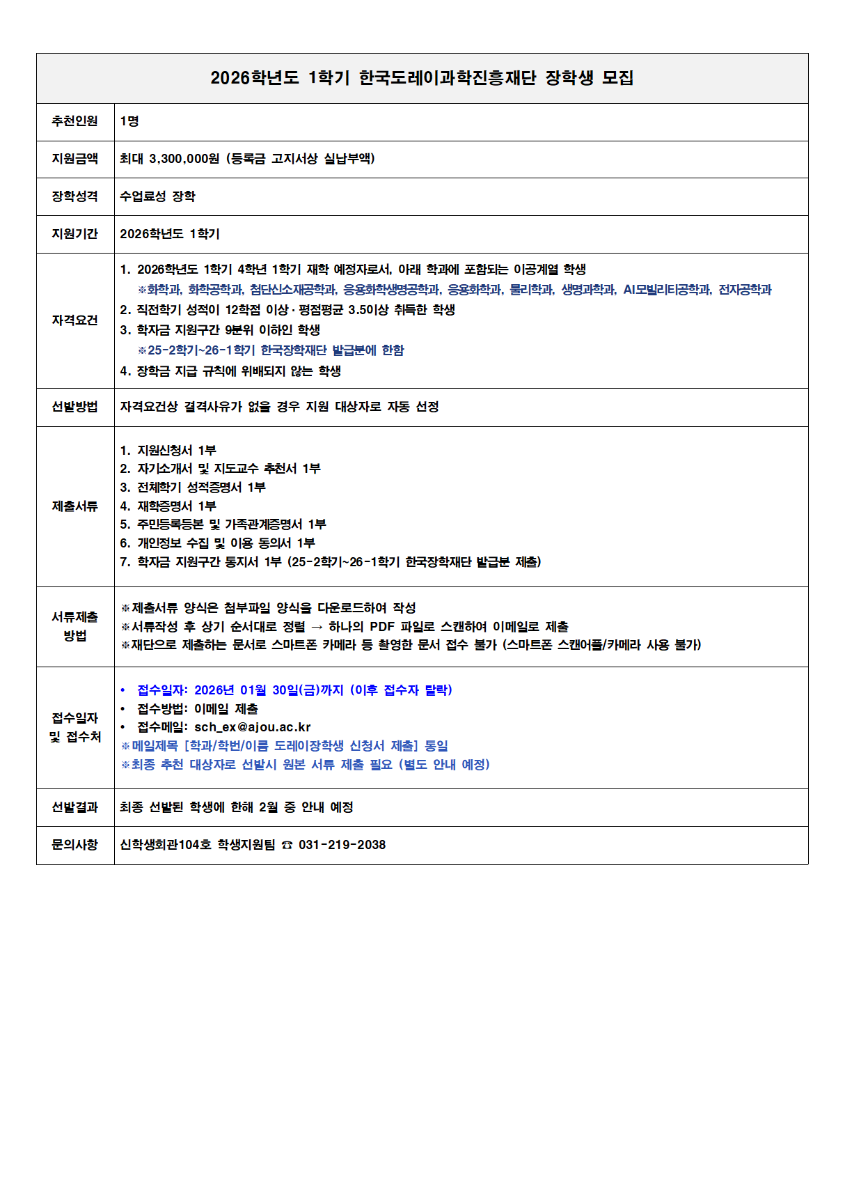 [장학] [교외장학] 2026학년도 1학기 한국도레이과학진흥재단 장학생 모집 공고(~01.30.(금)까지)