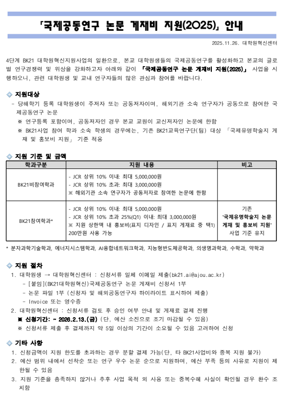 4단계 BK21 대학원혁신지원사업의 일환으로, 본교 대학원생들의 국제공동연구를 활성화하고 본교의 글로벌 연구경쟁력 및 위상을 강화하고자 아래와 같이 「국제공동연구 논문 게재비 지원(2025)」 사업을 시행하오니, 관련 대학원생 및 교내 연구자들의 많은 관심과 참여를 바랍니다