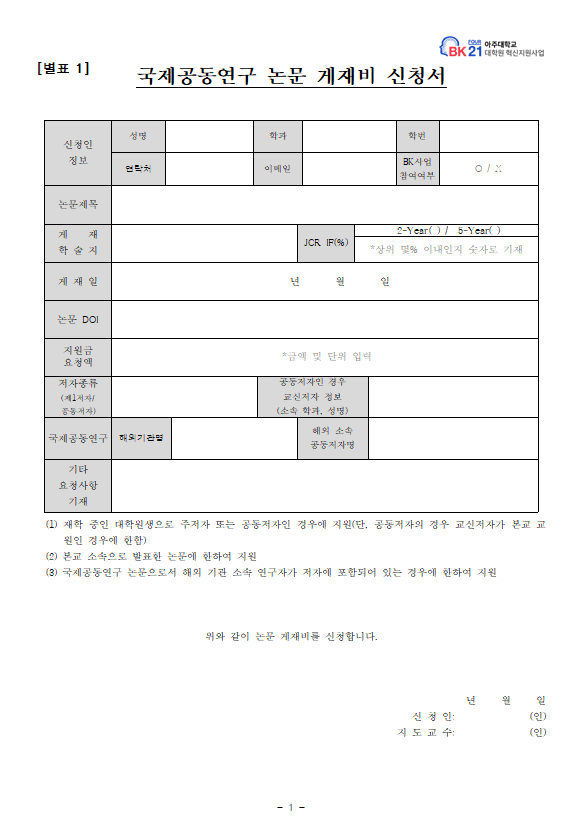 - [붙임](BK21대학원혁신)국제공동연구 논문 게재비 신청서 1부