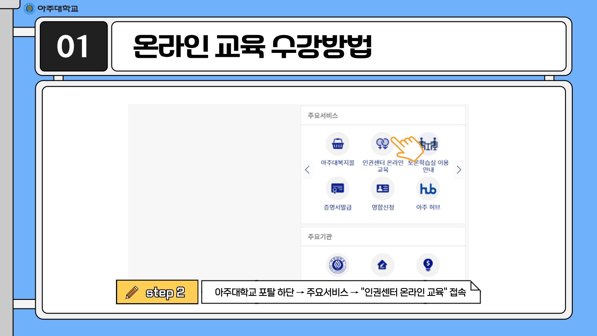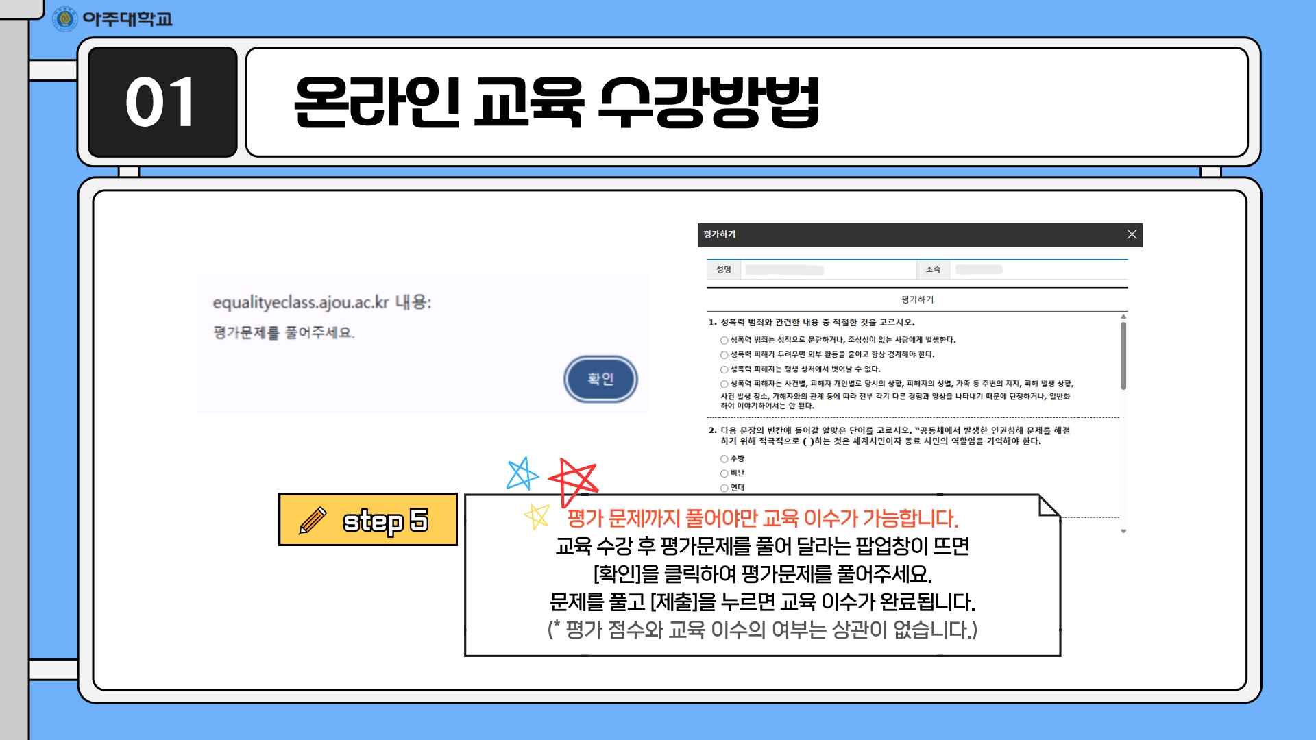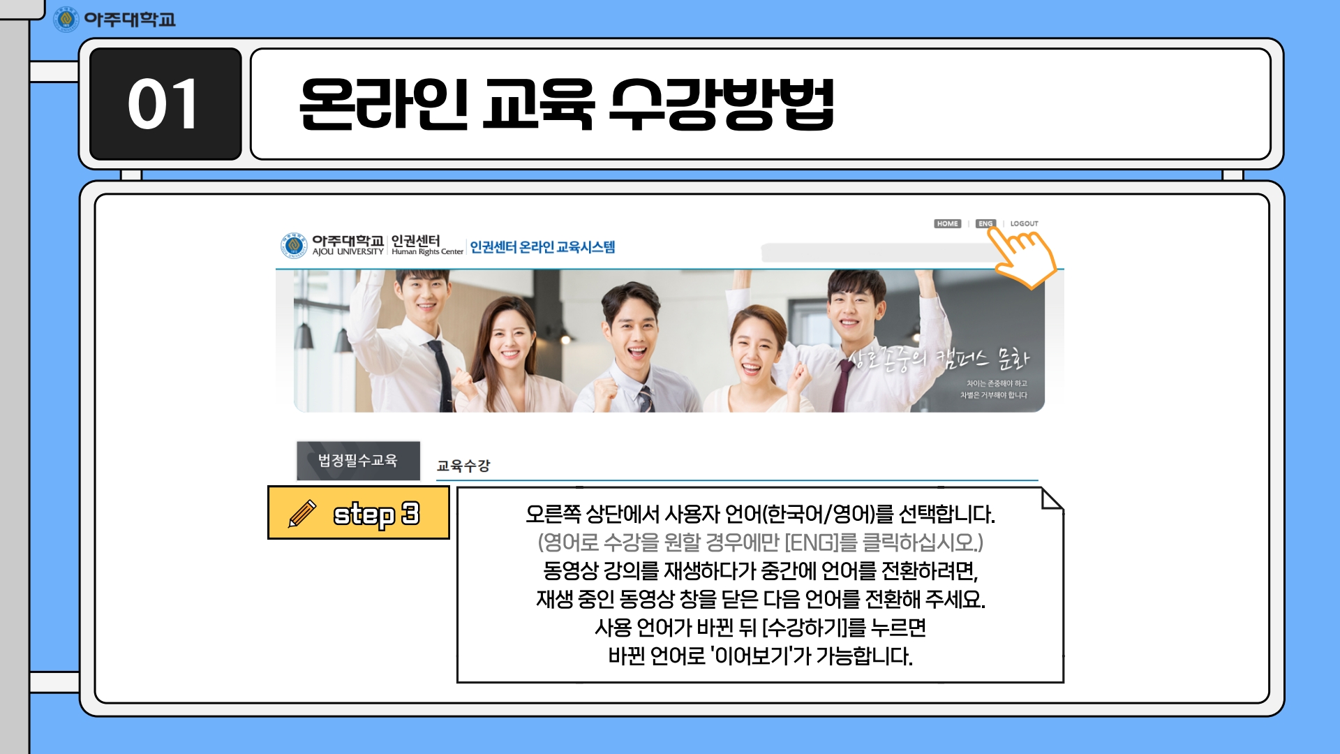 • 온라인 (아주대학교 포탈 → 주요서비스 → 인권센터 온라인 교육)