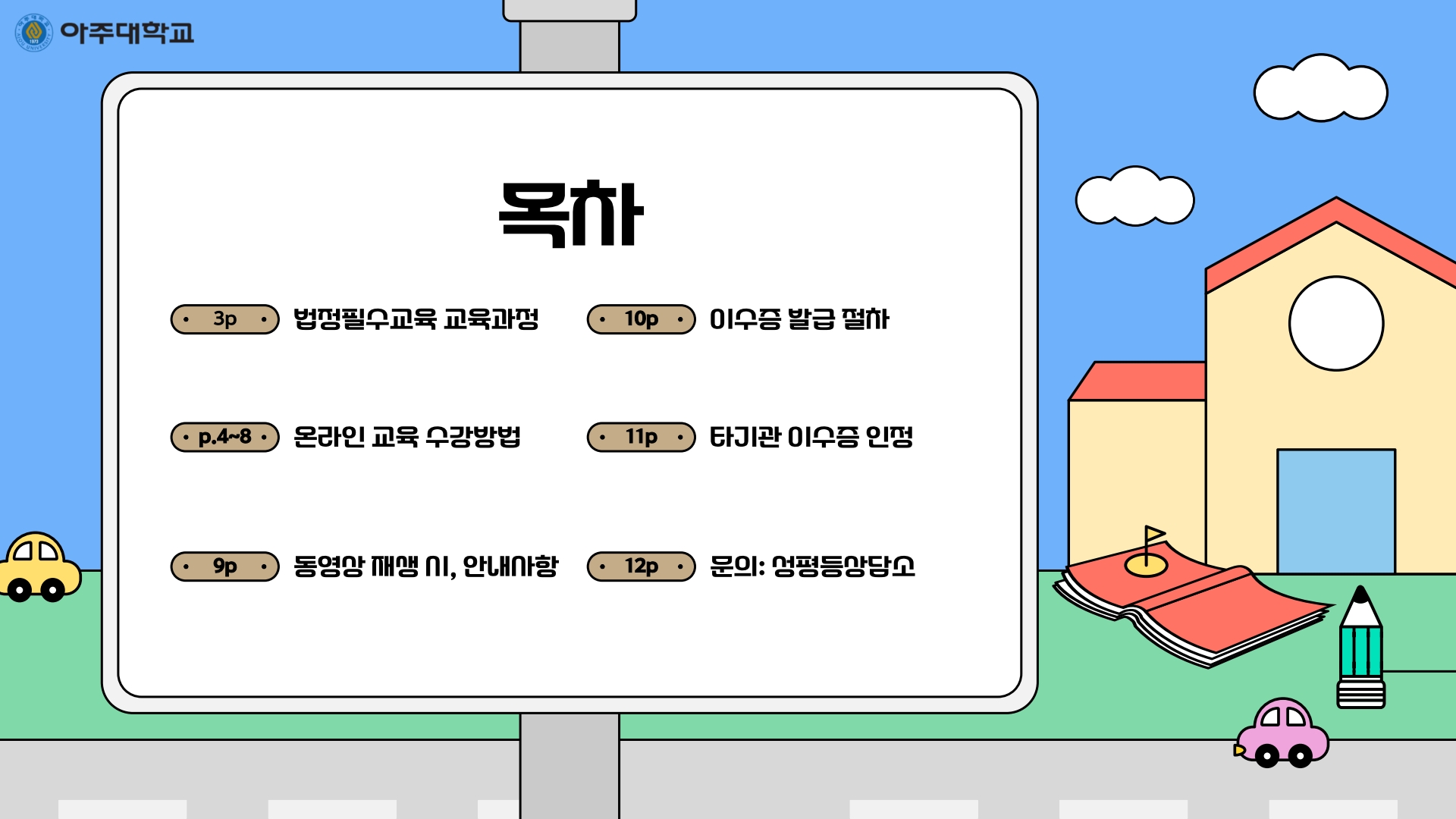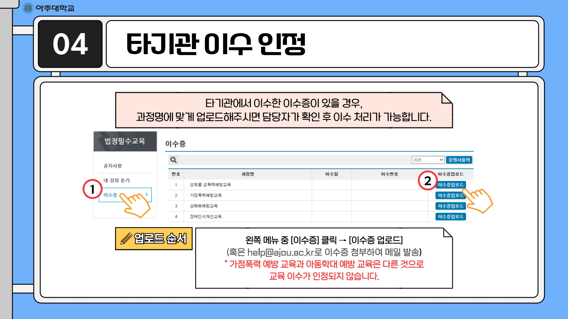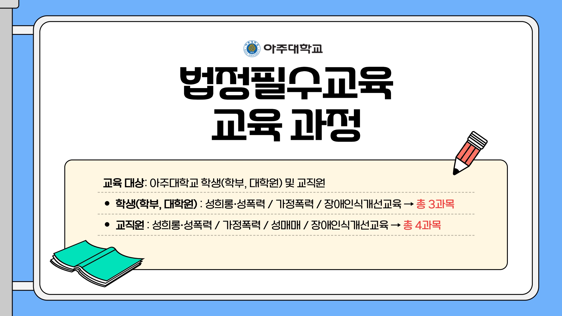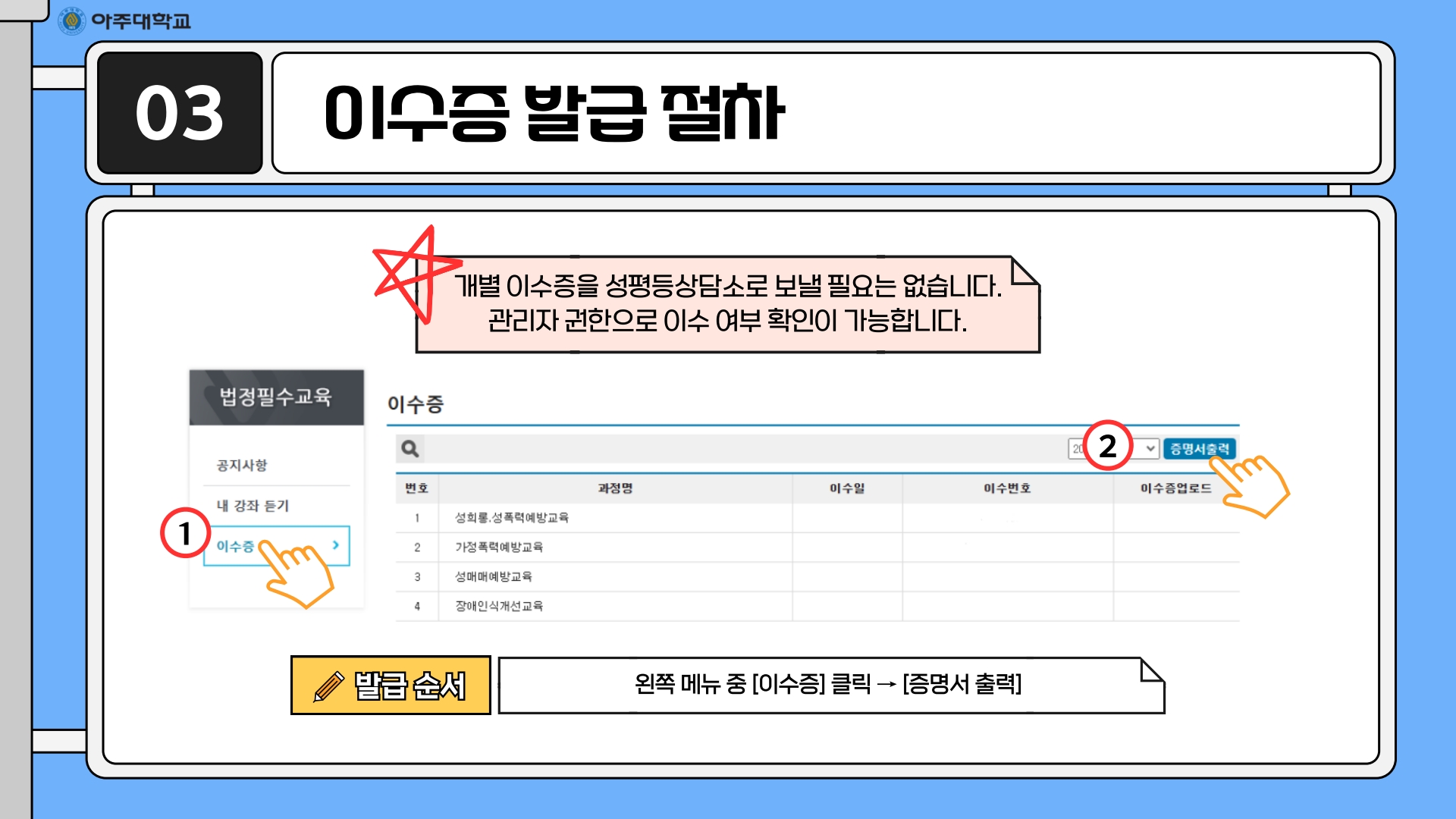 • 온라인 (아주대학교 포탈 → 주요서비스 → 인권센터 온라인 교육)