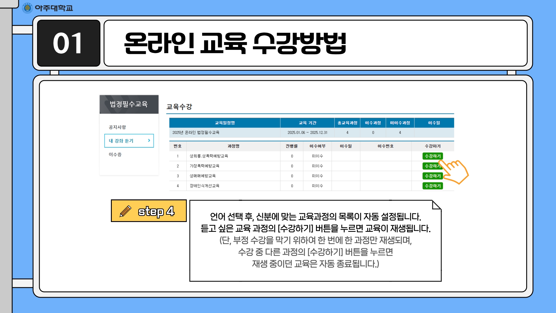 • 이수 확인 방법: 진행률이 100으로 뜨고, 이수 여부에 '이수'라고 적혀있으면 이수 완료된 것입니다.