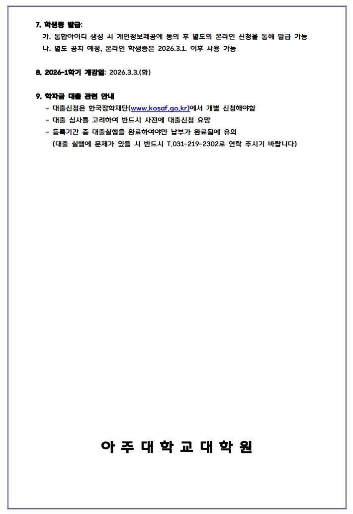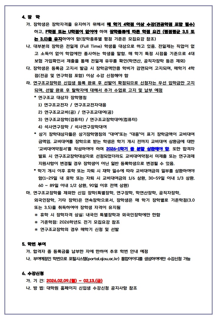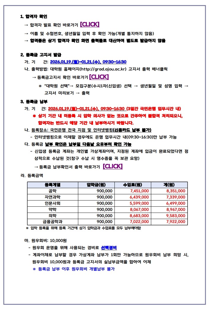 • 등록금 납부 및 기타 유의사항은 게시글 내 첨부파일 '2026학년도 전기 일반대학원 수시1차 모집 합격자 유의사항'에서 확인 바랍니다.