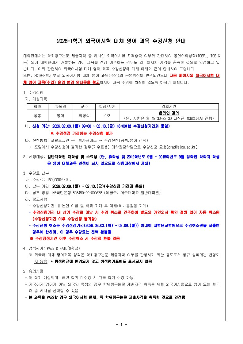 2026-1학기 외국어시험 대체 영어 과목 수강신청 안내 드립니다.