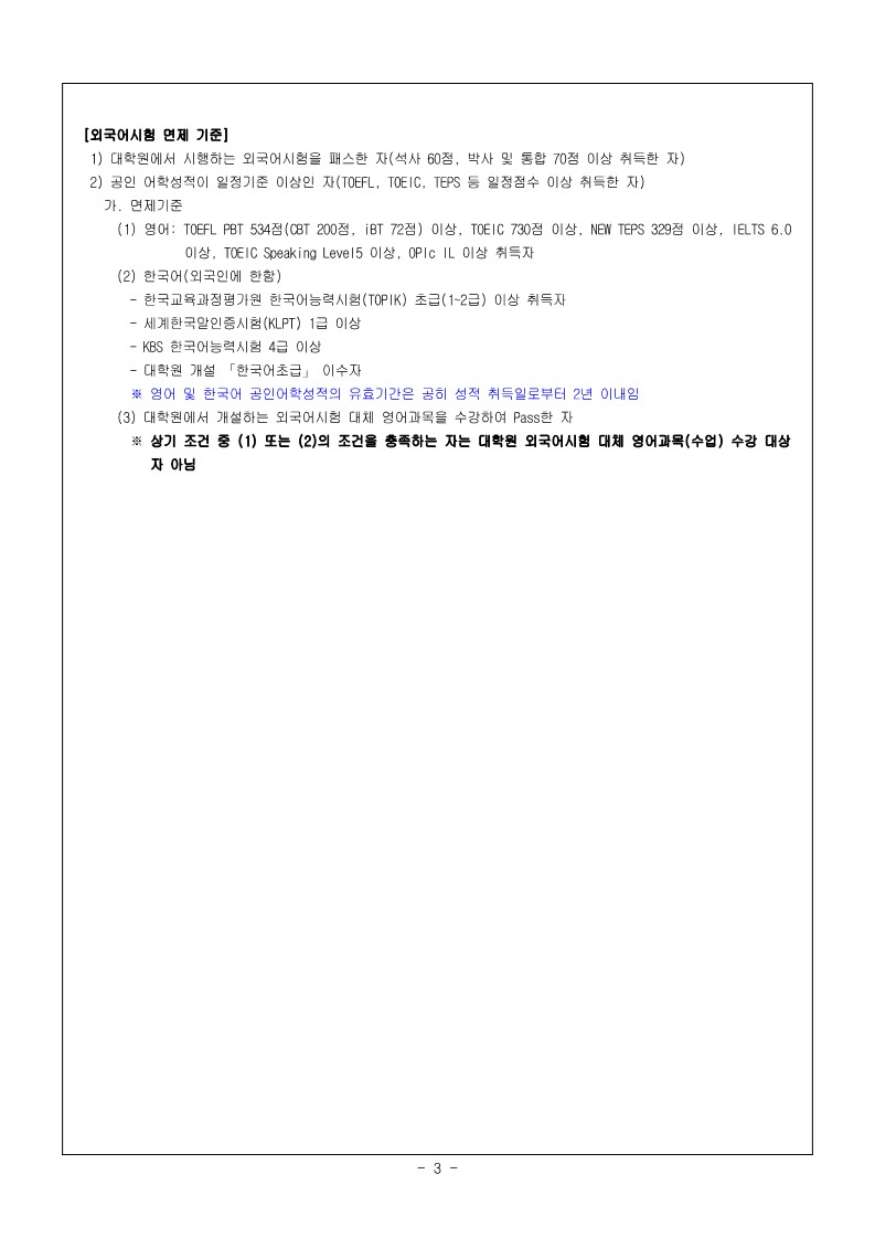 • 외국어 대체 영어과목 성적은 학위청구논문 제출자격 여부를 판정하기 위한 용도로서 정규 성적에는 반영되지 않음