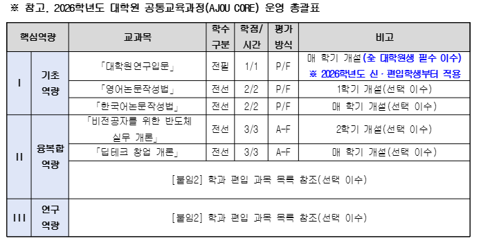※ 참고. 2026학년도 대학원 공통교육과정(AJOU CORE) 운영 총괄표