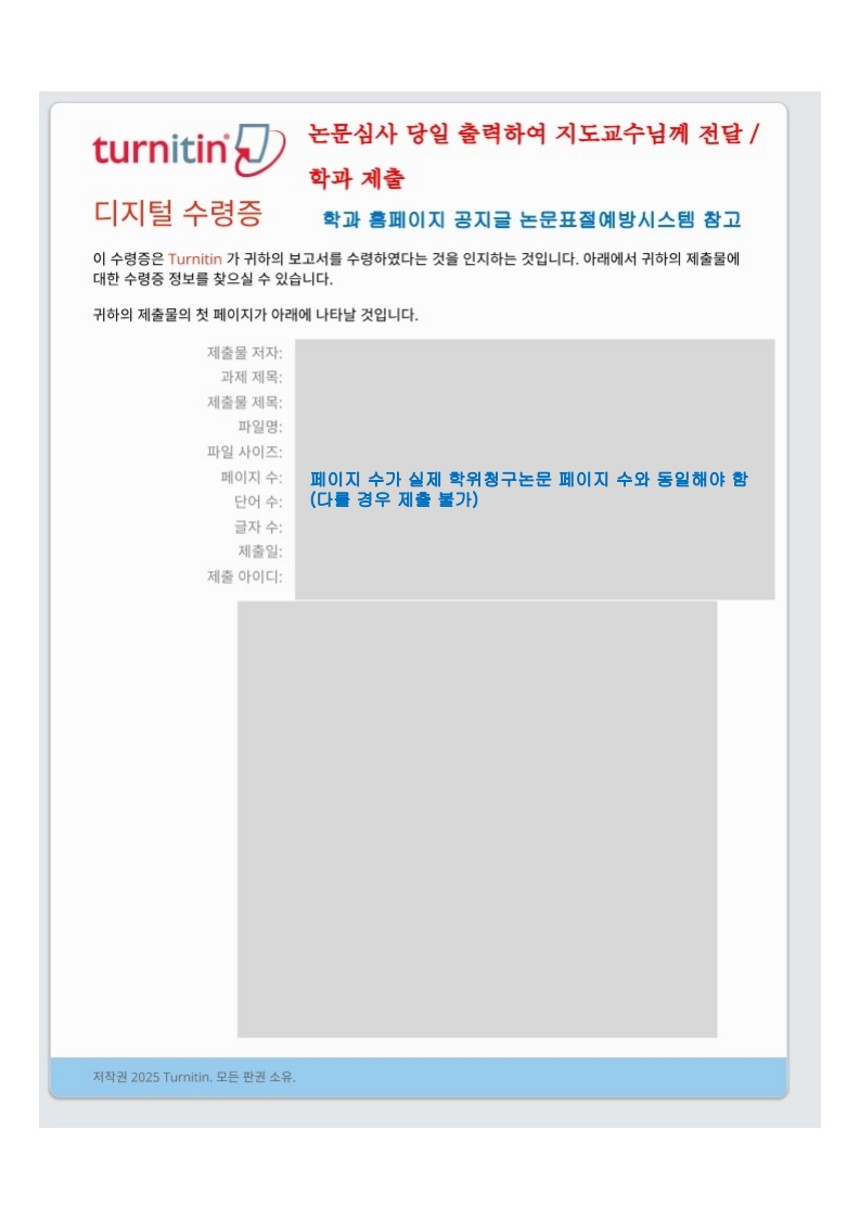 결과 제출 | 최종 결과보고 제출일 | 학위논문 표절점검 확인서(별도 양식) 1) [현재보기] 페이지 2) [디지털 수령증] 페이지 | • 지도교수 확인 및 날인 후 '심사 결과보고서'와 함께 학과로 제출 • 학생 → 학과에 제출 • 이메일 또는 팔달관 408호로 대면 제출 |