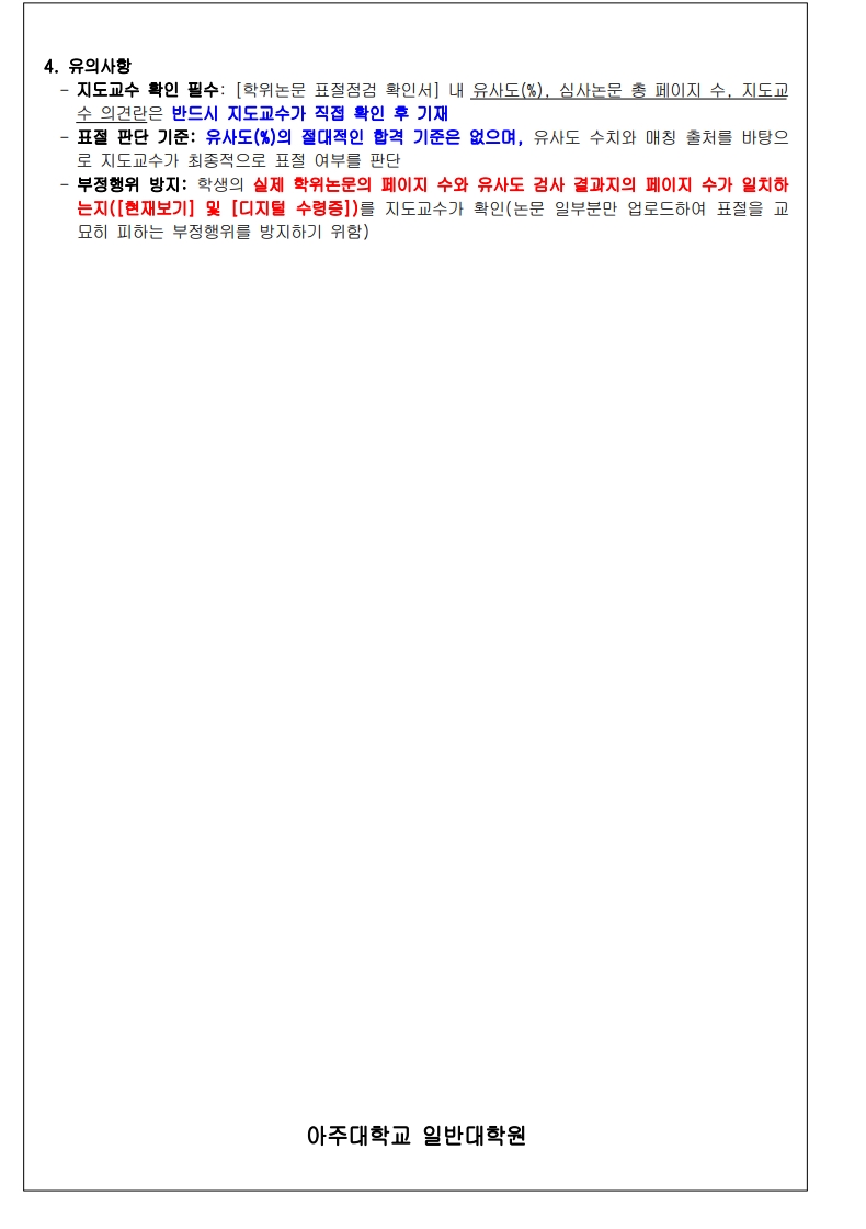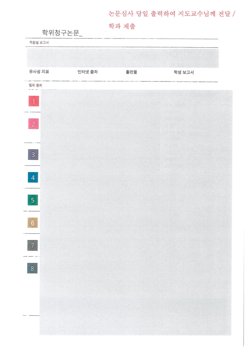 • 지도교수 확인 필수: [학위논문 표절점검 확인서] 내 유사도(%), 심사논문 총 페이지 수, 지도교수 의견란은 반드시 지도교수가 직접 확인 후 기재
