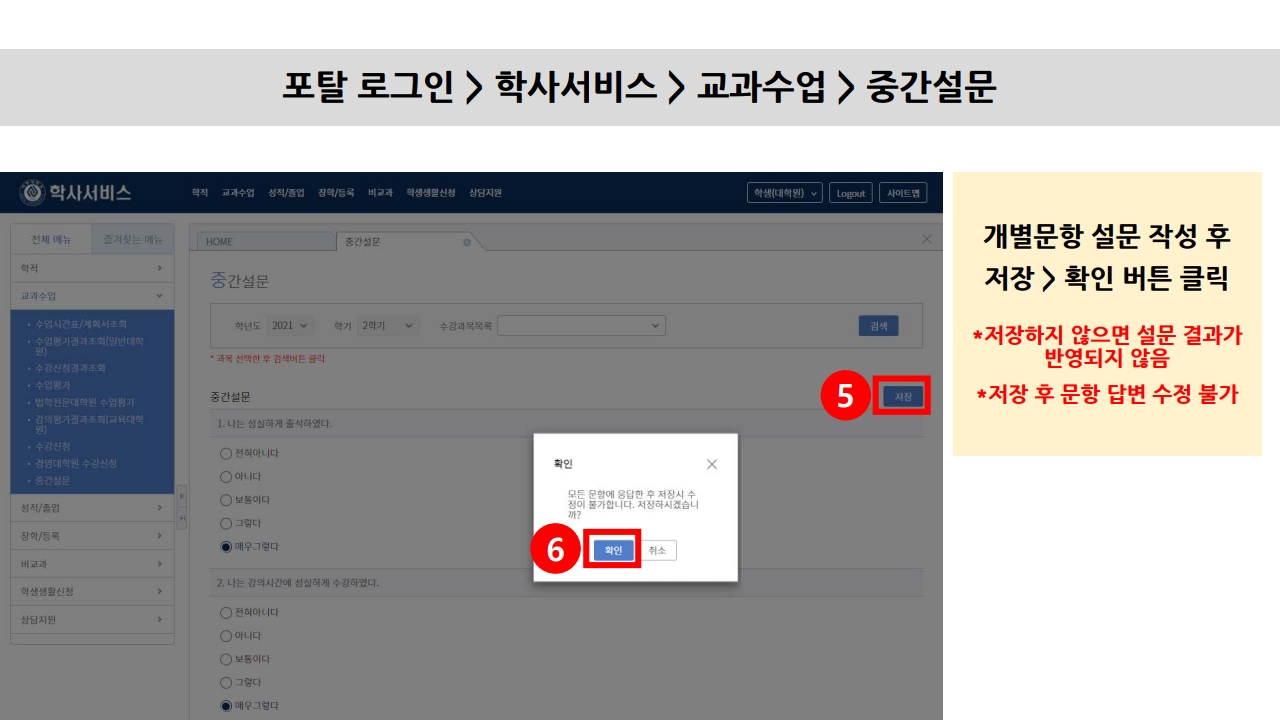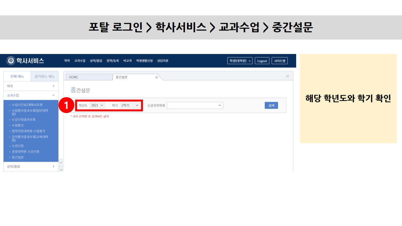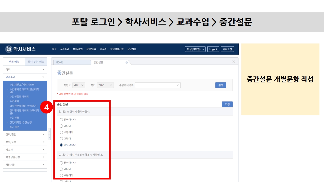 • 포탈 로그인 → 학사서비스 → 교과수업 → 중간설문